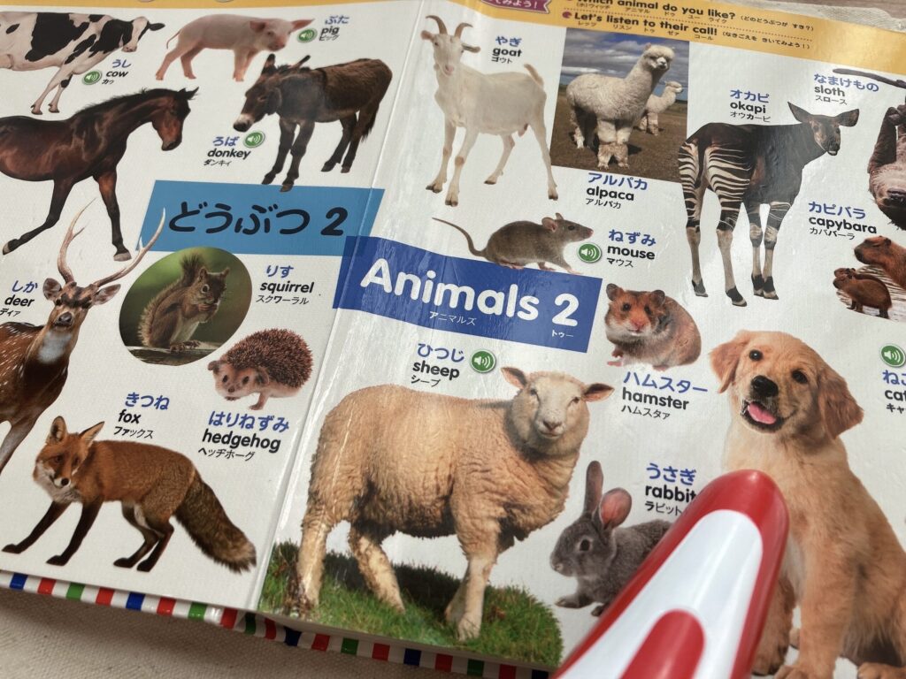 2歳になった頃から遊び方が変わり、自分で「しぇん(はじめてずかん1000)!あそぶ!」と図鑑とペンを自分で持ってきて広げるようになりました。少し前までは、同じ所を連続タッチしてばかりでしたが、今ではちゃんとひとつずつタッチして名称も復唱できるようになってきました。