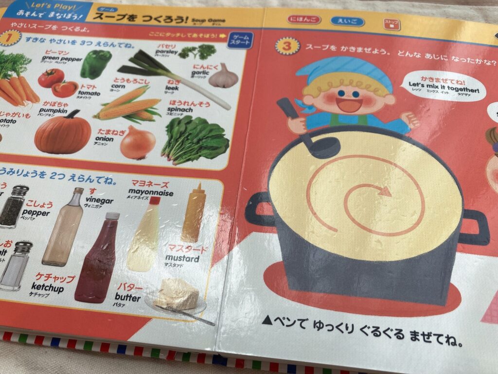 好きな野菜と調味料を選んで、ペンをぐるぐる回してスープを完成させるというページが特にお気に入りです。